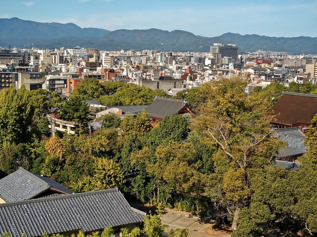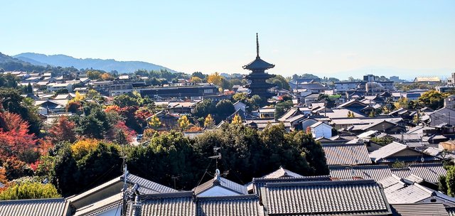 少しずつ色づいてきた東山に京都市街、南には瓦屋根を見下ろすように建っている八坂の塔も。