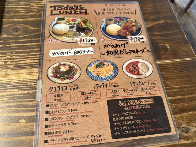 ランチは唐揚げをメインにしたプレートのほか、タコライスやパッタイなど多国籍なメニューも展開。ドリンクをお得にセットにすることもできます。
