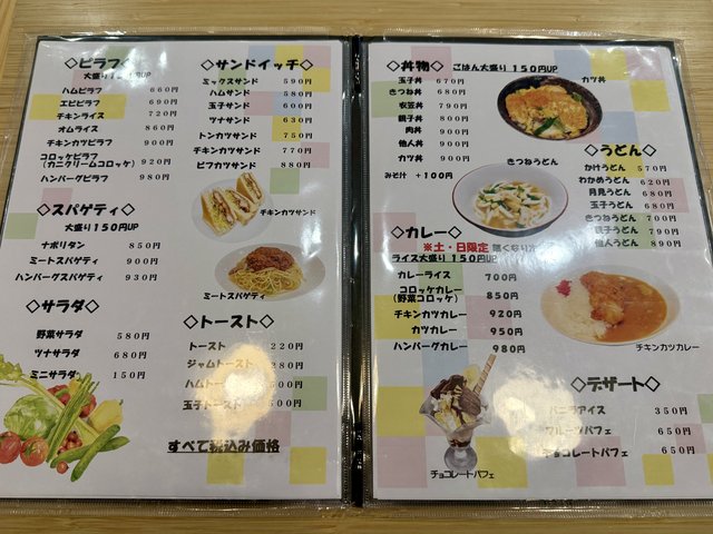 ピラフやスパゲッティ、サンドイッチなどのカフェメニューのほか、丼ものやうどんもスタンバイ。さらに、土日限定でカレーも用意されています。
