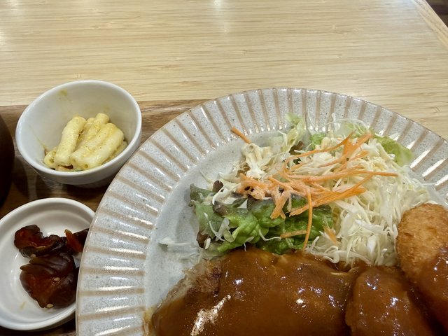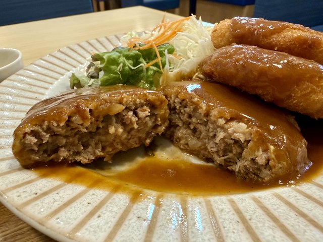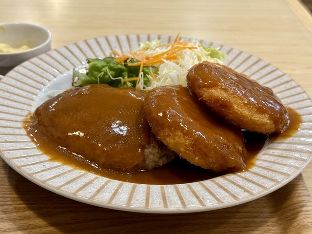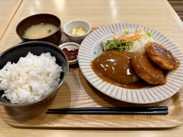 ハンバーグはふっくらと柔らかな食感で、あっさりめながらコクのあるソースがごはんを進ませます。セットとは思えない大きさで、食べ応えもあります。