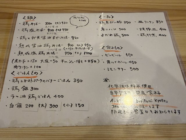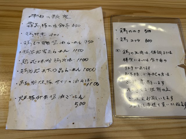 店名の通り、鶏と自家製麺に特化したラーメン店。メニューは、鶏そば、鶏塩そば、鶏と卵黄醤油のまぜそば、熟成醤油鶏そば、熟成塩そばといったラインナップ。ノーマルはあっさり、熟成系は濃厚でコクのある味わいが特徴です。