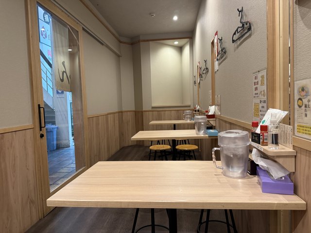 店内は細長いレイアウトが特徴で、手前にテーブル席、奥にカウンターとキッチン。隣の焼肉店と奥の扉でつながっているような造りで、比較的広い区画を2店舗で分けている印象です。