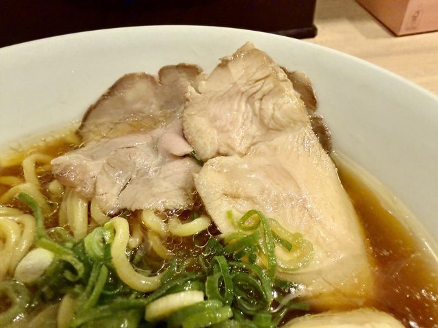 チャーシューは豚肩ロースと鶏むね肉の2種類。どちらも低温調理でしっとりと仕上げられており、淡麗スープとの相性も抜群です。