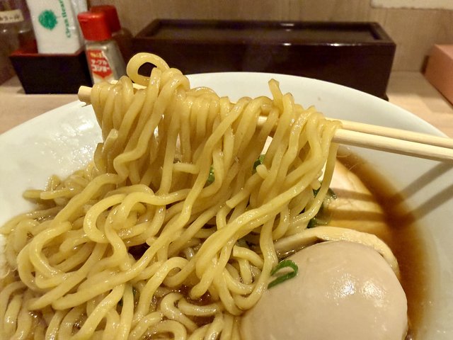もっちりとした食感にほどよいコシがあり、縮れによってスープとの絡みも良好。縮れの不規則な口当たりが心地よく、食べ進める楽しさがあります。
