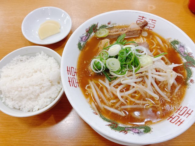 ラーメンにツヤツヤの白ご飯、そしてたくあん。炭水化物×炭水化物という、町中華ならではの背徳感あふれる組み合わせがたまりません。