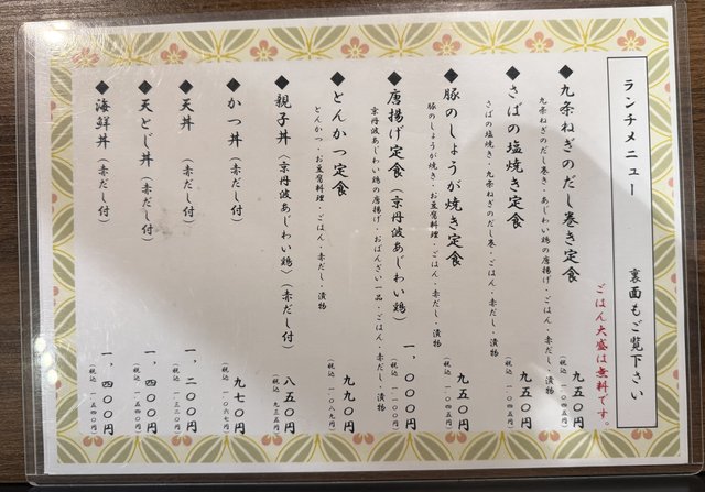 九条ねぎのだし巻き定食、さばの塩焼き定食、豚の生姜焼き定食、とんかつ定食、親子丼、カツ丼まで、1,000円以下のメニューがこれだけ揃うのはありがたいところです。