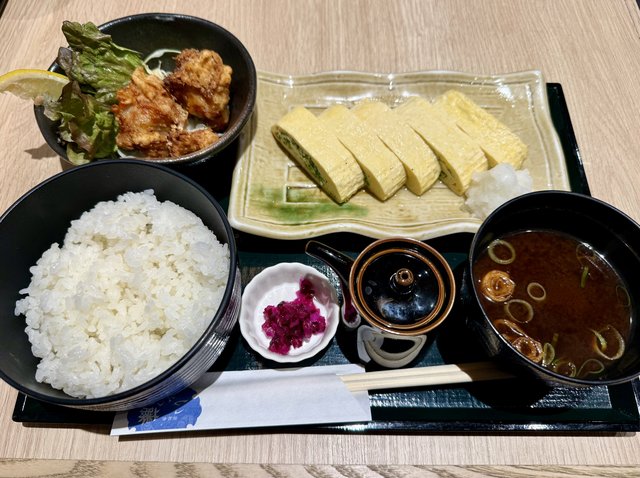 九条ねぎのだし巻き、あじわい鶏の唐揚げ、ごはん、赤だし、漬物がセットに。さらに、ごはんの大盛りは無料といううれしいサービスもあります。