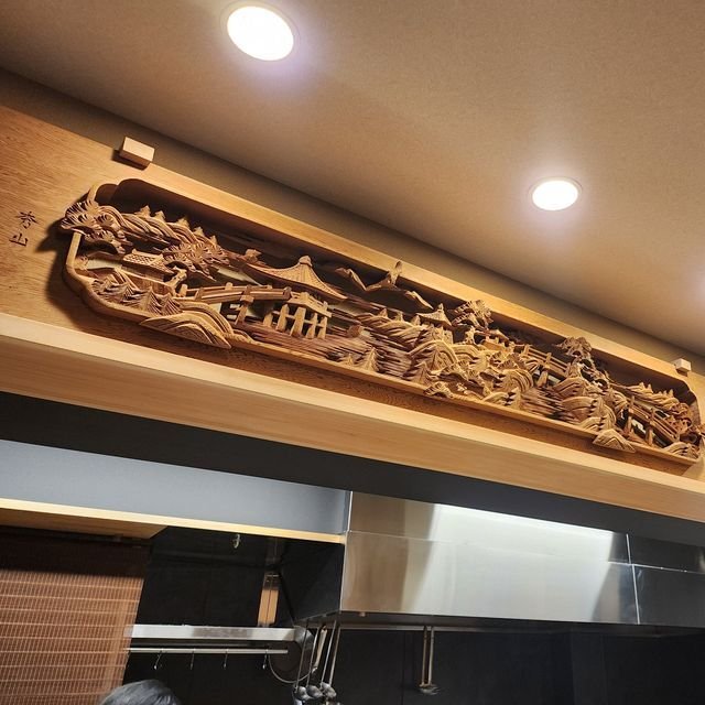 カウンターの上にはで、ご店主のこだわりでいれためっちゃゴージャスな手掘りの欄間(滋賀の作家さんによるものらしいです)がババーンと。こういうのは中国の故事に肖っていたりするんだろうな!と思いつつ。