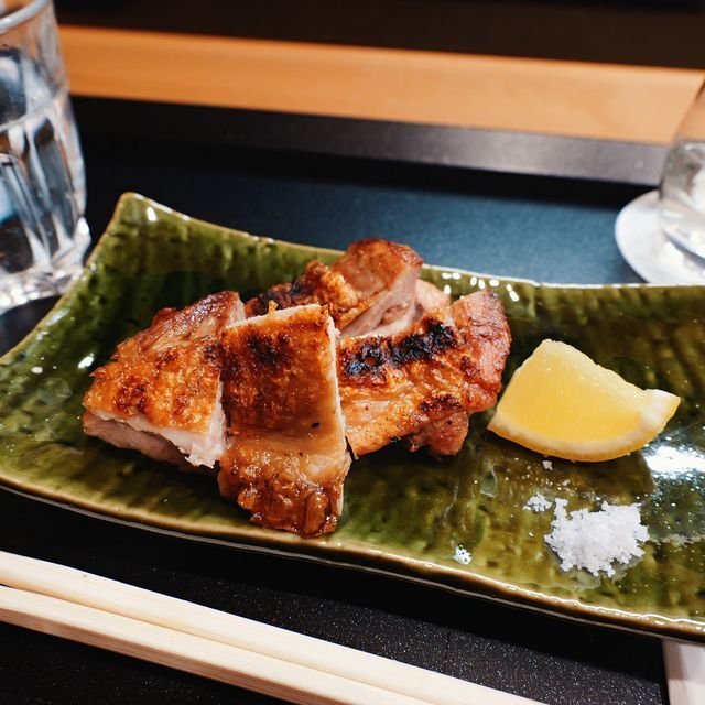 ご店主が炭火でじっくり炙ってくれた「丹波鶏のモモ塩焼」¥1200がお料理四品目。皮はサクサク、パリンパリンに仕上がっていて身はジューシー。いやーこりゃ美味しい。本日一!と思ったのですが、後でこれを越えてくるのが登場。御店主曰く、基本お料理は四条大宮で出していたものと変わっていないんですよ~とのこと。(そりゃ、呑み友に人気があったわけだと納得。)