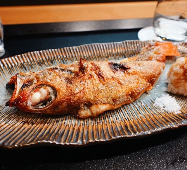 で、25cm級の「のどぐろ塩焼き」がお料理五品目。¥4000~!といいお値段なのですが、これも相方と半身づつ。いやー、こりゃ火入れお上手ですな。塩の乗せ具合、脂が活性化する程よい火の入れ方もばっちりで、こりゃ日本酒が進みます。初め見せてもらった6種類は呑んでしまったので、もちょっとガッチリしたのはありますかね?と確認すると・・・
