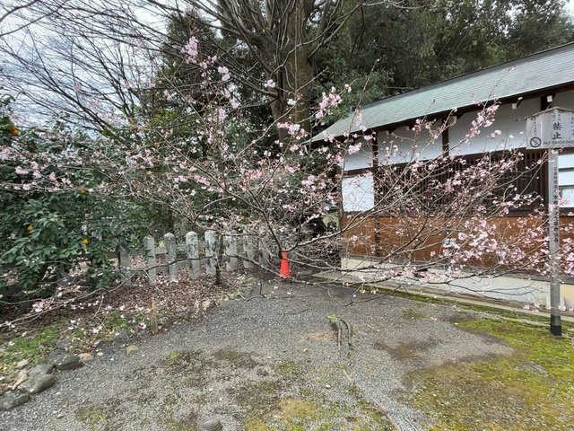 寒中にもかかわらず桜の神社らしく、『十月桜』と呼ばれる10~4月開花の早咲き品種の桜も開花中。