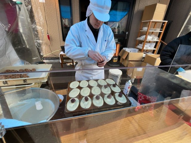 店頭でカステラ生地を焼き上げ、それにあんこを包んだ出来立ての美味しさが楽しめるお菓子で、十日ゑびすでは1月8~11日の4日間の販売予定ですが、毎年超人気で早々に完売することも。他、秋の二十日えびす大祭時にも販売されています。