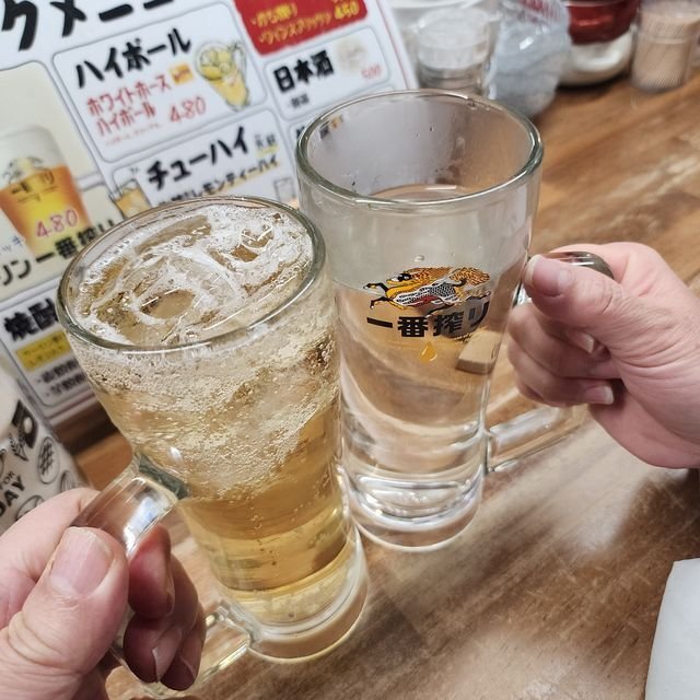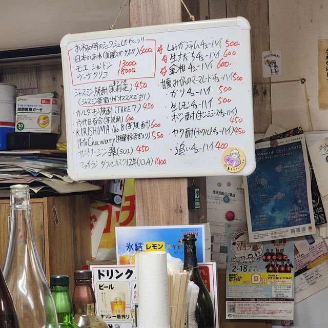 何はなくともこれですな。ワタシは「ホワイトホースハイボール」¥480を。相方は「麦焼酎お湯割り」(六代目百合なる銘柄)¥600で再び乾杯を。このあと、奥のお兄さんと入れ替わりで常連のお姉さん2人組が入ってきて、いきなり店内が賑やかになるわけで。
