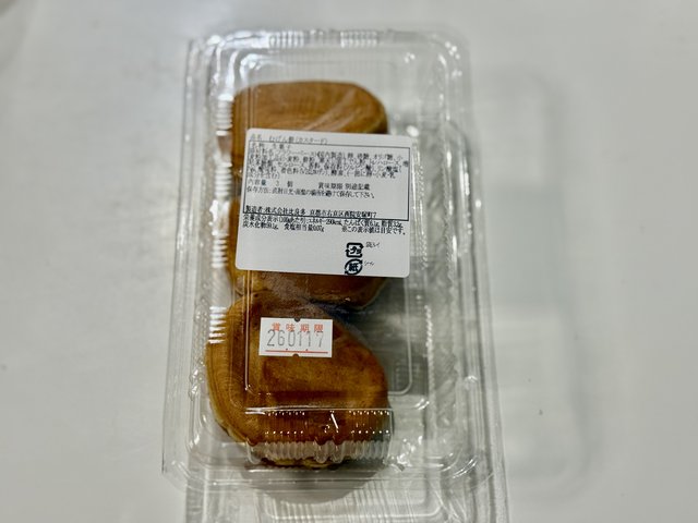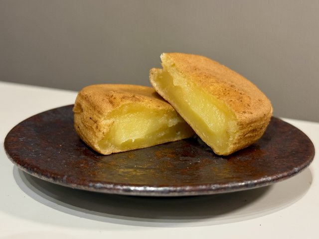 今回はカスタード入りの「むげん餅(3個入)」を購入しました。京都ではお馴染みの、餅粉を使ったもっちり食感の焼き菓子に近いタイプの商品です。
