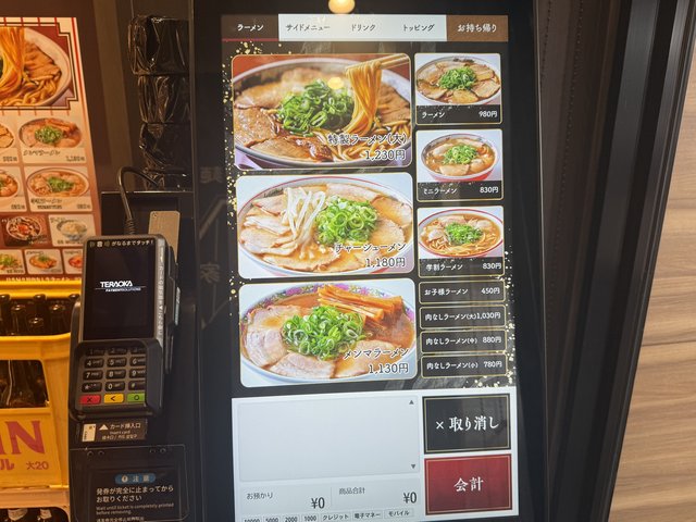 入店してすぐの場所に券売機があり、まず食券を購入します。キャッシュレス対応で便利です。