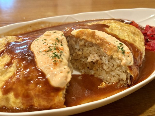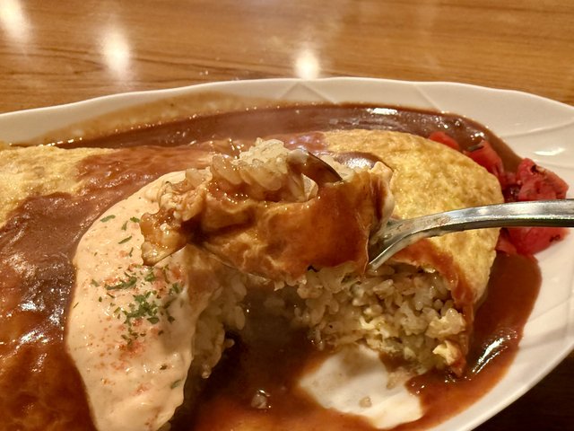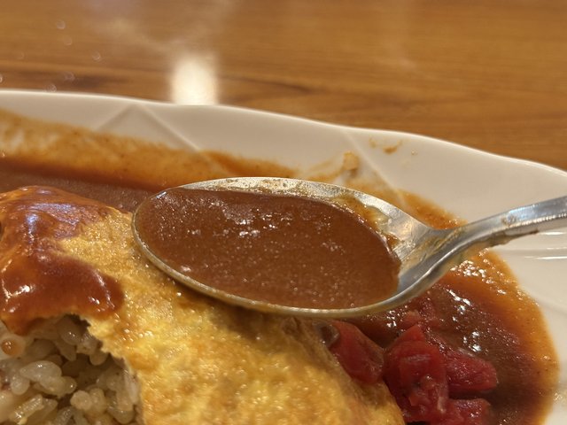 デミグラスソースも秀逸。重すぎず、ほどよい酸味があります。ドライカレーを単体で食べるとカレースパイス感は控えめですが、ソースと合わせるとふわっと香りが立ち、カレー感が高まり、完成された味わいに。この変化がクセになります。