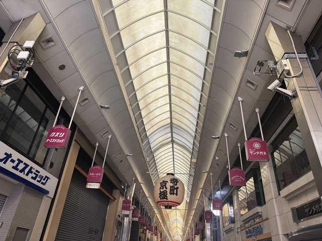 寺町京極商店街。人通りも多く、にぎわう商店街です。河原町や新京極より少し落ち着いた雰囲気で、飲食、アパレル、物販と、老舗から新店まで多彩な店舗が軒を連ねます。