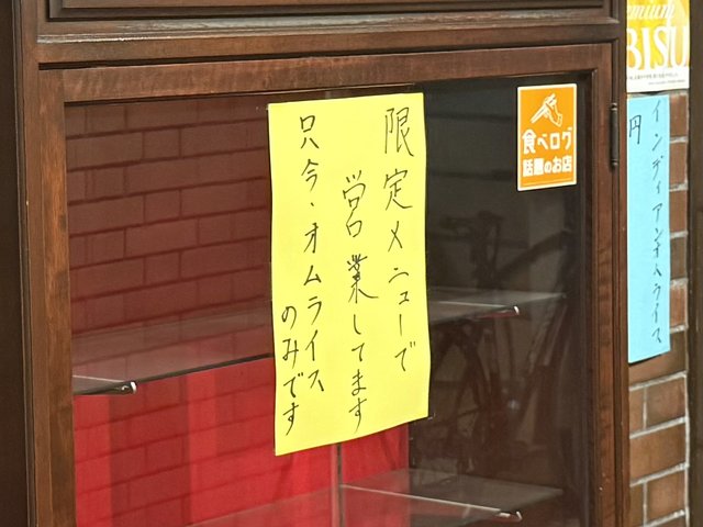 店頭にある通り、現在はインディアンオムライス 900円のみの限定メニューでの営業で、サラダもありません。そのためメニュー表もなく、並と大盛りの2択です。今後も、過去のメニューに戻る予定はないそうです。