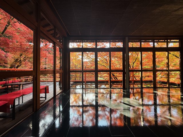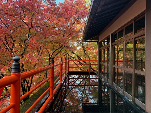 テラスの一角は水鏡になっており、自然そのものが映し出されます。もみじの色彩に欄干の朱がよく映え、美しいコントラストを楽しめます。