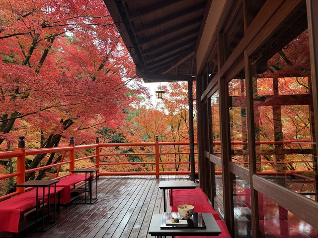 テラス席では、目の前に広がる燃えるようなもみじを眺めながら、静かに流れる時間を味わえます。まるで紅葉に包み込まれるような感覚です。