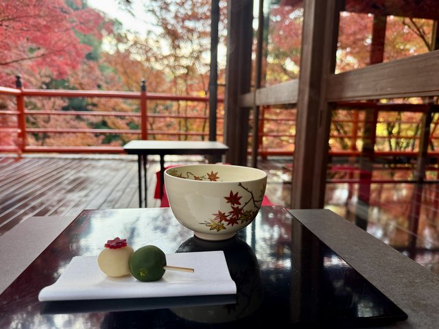 丁寧に点てられた抹茶とお団子でひと息つきました。今熊野観音寺らしさを感じさせる、もみじを模した抹茶碗も印象的です。