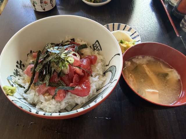 麺類やどんぶりもいいですが、市場ならではのメニューで、売り切れ必至の「まぐろ丼セット」は、玉子入りの味噌汁と漬物付きで880円。