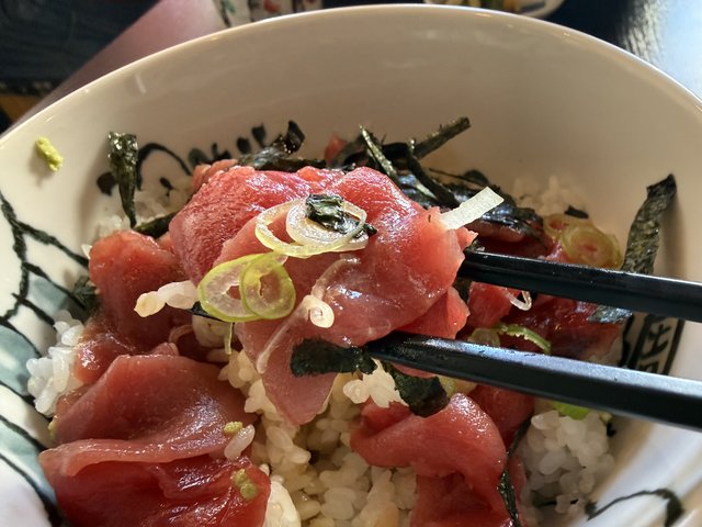 美味しそうなマグロがたっぷりとのった一杯。寿司屋とは違い整った部位ではないものの、赤身の濃い旨味や脂の甘みなど、マグロ本来の美味しさをしっかり楽しめました。