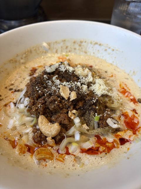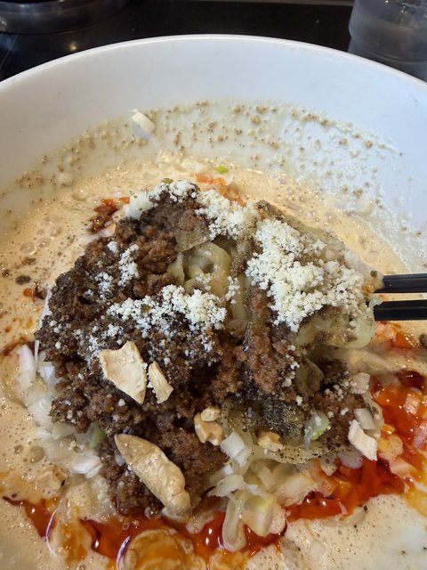 ふわっと泡立ったごま豆乳スープのやわらかな白に、中央に鎮座する濃厚な肉そぼろ。その上にほんのりとかかったチーズ。湯気と一緒に立ちのぼるごまと香ばしさの香りが、もう反則級!!!