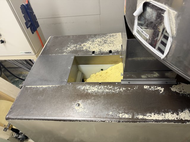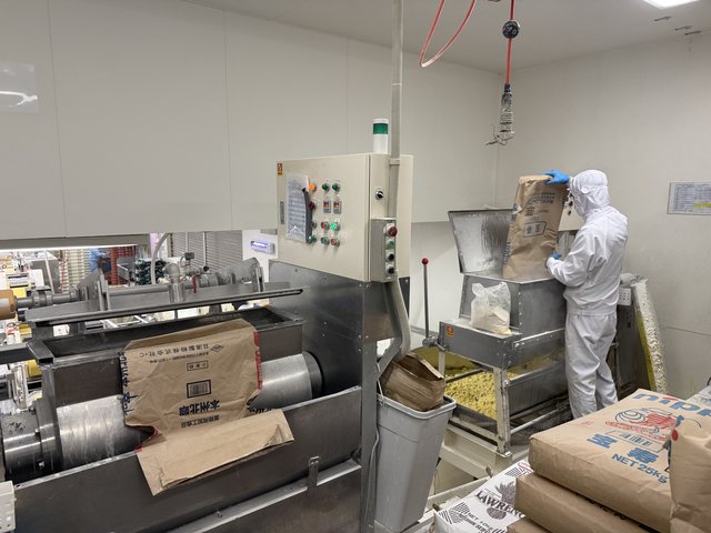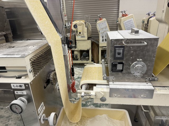 製麺を支える大型の真空ミキサーは3台。3本のラインで製麺が行われています。1台50キロ対応のミキサーで、大きな小麦粉の袋を2つ担いで投入するため、なかなかの重労働です。