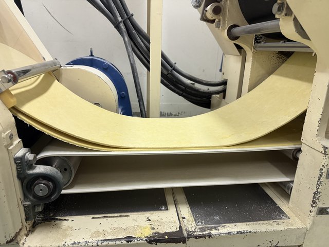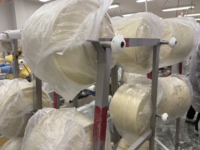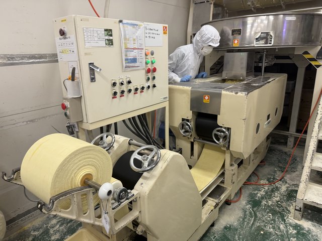 流れるように麺帯が作られ、くるくると巻かれて巨大なロール状に。先ほどまで粉だったものが、美しい麺帯のロールへと変わっていく様子は圧巻です。
