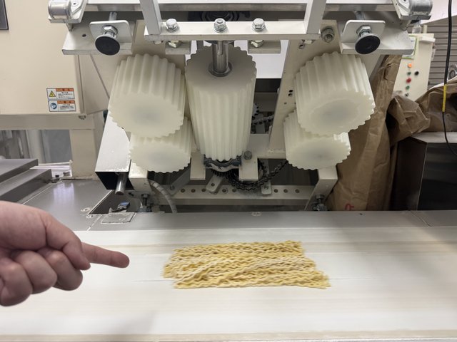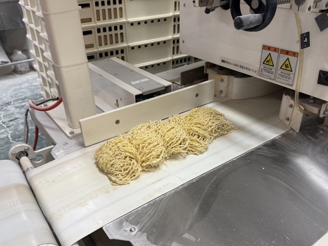 長かった麺は1玉ずつに切り分けられ、上部の白い機械で圧を加えることで、手揉み風の食感と弾力が生まれます。ここまでくると、私たちがよく知る麺の姿になります。