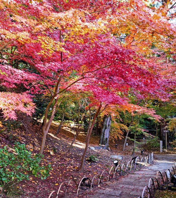 小径を奥へ進むと美しく色づいた樹々と常緑樹のコントラストが見事な景色を見せてくれました。