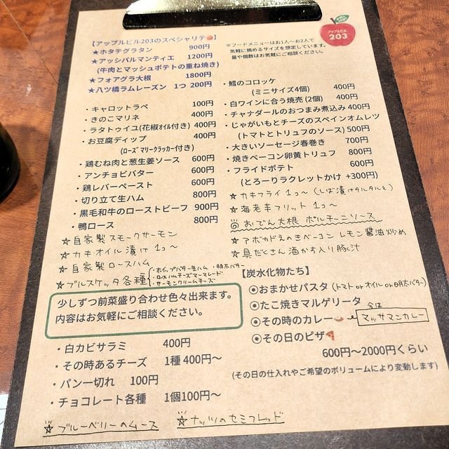 大和大路四条下ル西側にある雑居ビル「アップルビル」の203号室にあるワインバル「アップルビル203」なり。気が付けばもう4回目の訪問。ワインバルですが、ふんわり接待のご店主が作るセンスのあるお料理が美味しい(&めっちゃお安い)ので気に入っているお店。