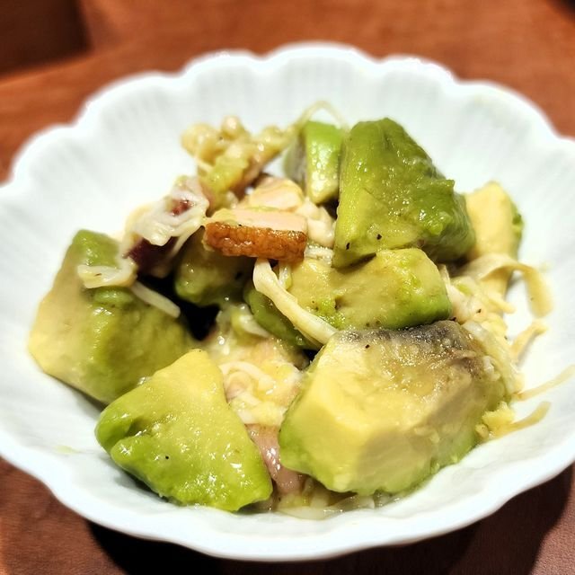 「アボガドエノキベーコン レモン醤油炒め」なり。こういう家庭的で美味しい、かつヒネリの効いたアテが各種揃っているのだ。
