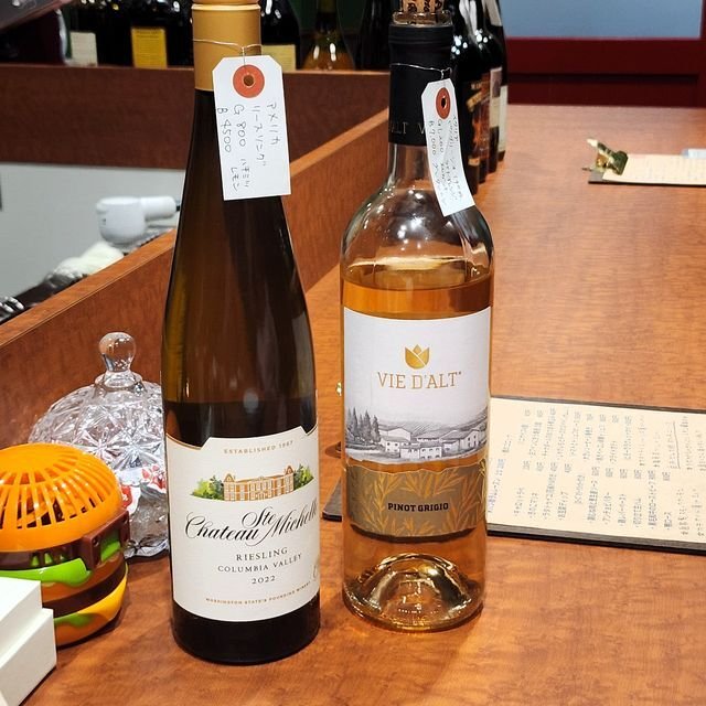 で、当然このお店ではワインを合わせるでしょうということに。相方は白をお願いし、この2本を出して貰いました。確か、左側を吞んだような~。(米カリフォルニアの白、「Chateau Ste. Michelle Columbia Valley Riesling 2022」なり。リースリング100%で付箋に「蜂蜜レモン」と書いてあるのですが、その通り!という。¥800とリーズナブルなデイリーユース系。全然美味しい。