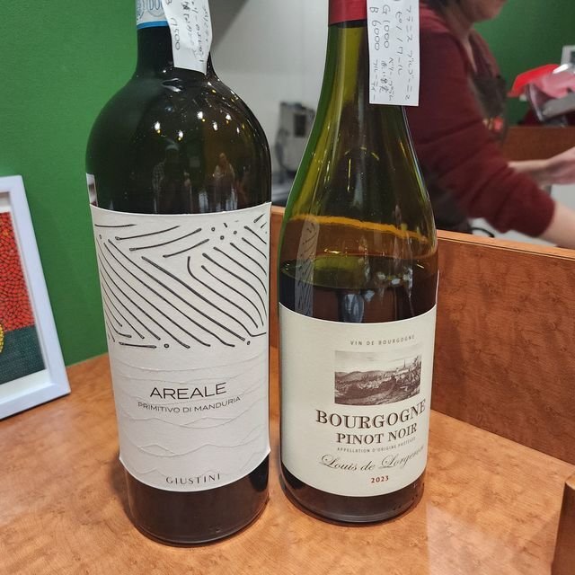 ワタシは珍しく赤を。右手は仏ブルゴーニュで「Chateau Ste. Michelle Columbia Valley Riesling 2022」なるピノノアール100%。左手、伊プーリア「Giustini Areale Primitivo Manduria 2022」で、こちらはプリミティーヴォ100%でした。結局両方呑みまして、初めに左を、次に右を吞んだような。