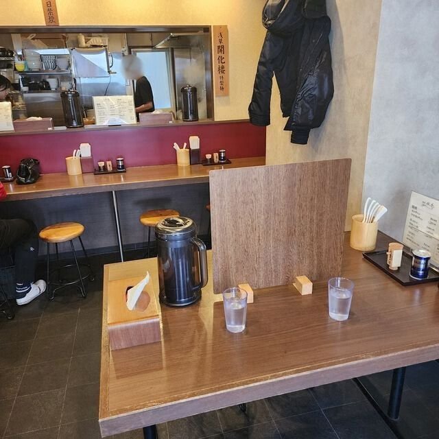 入口そばに小ぶりな券売機がありまして、そちらで食券を買う方式。直ぐにスタッフのお姉さんがチケットを取りに来てくれるのでお渡しし、テーブル席に陣取るわけで。カウンターが4席、4人テーブル1つでカップル用にテーブルの真ん中をパーテーションで仕切る全8席というミニマム店。