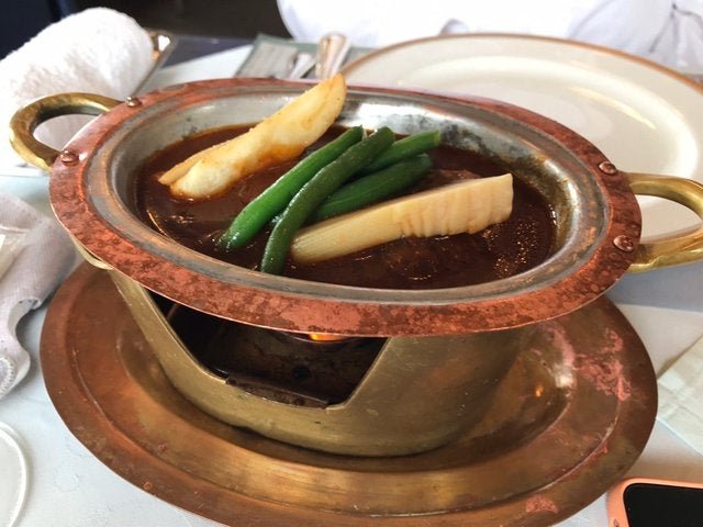 東山区四条大橋東詰にあり、大正5年(1916年)創業で100年超の歴史を誇る老舗洋食『レストラン菊水』。祇園のランドマーク的洋食店でもあり、京都の生き字引的お店でもあります。1階はカジュアルな喫茶洋食、2階は本格レストランに。その2階レストランのスペシャリテとも言うべきビーフシチューボルドー風は、古式ゆかしい銅製鍋で提供されるレトロ感も味わえる一品。ホロホロの牛肉とともに深い味わいが堪能できる。