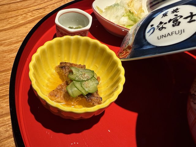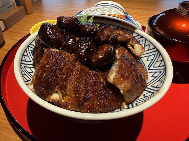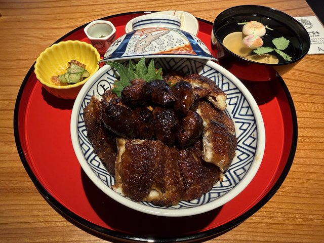 青うなぎをまるまる1本使用し、大きな肝を豪快にのせた特製どんぶり。うざく、あさりのお吸い物、刻みわさび、漬物がセットになっています。