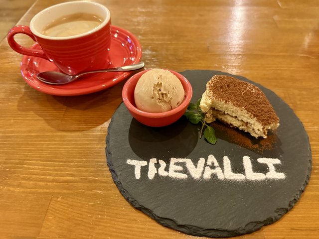 食後はドルチェとコーヒーを。ドリンクはコーヒー、紅茶、エスプレッソから選べます。この日のドルチェは手作りのティラミスと黒糖ジェラート。こちらももちろん自家製です。