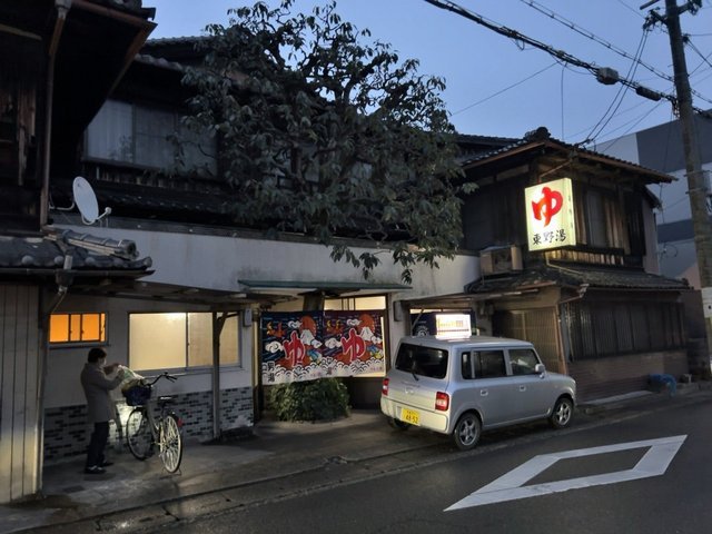 山科区、外環状線の西側に平行して走る通り沿いにある、昭和風情漂う木造建築の銭湯『東野湯』。創業昭和4年の老舗で、山科エリアで唯一現存する絶滅危惧種的銭湯でもあり。面白いのが、暖簾をくぐるとが天井を破って上に伸びる大木が男湯&女湯を隔てる。御高齢ご主人が一人で切り盛りされているため、施設の老朽化は否めないが、昔懐かしい雰囲気を味わえる。