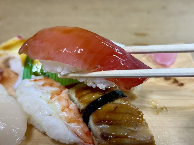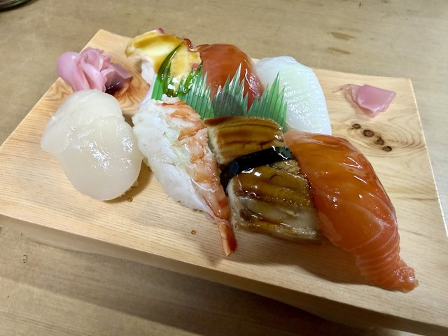 この日のネタは、タコ、マグロ赤身、いか、ホタテ、海老、穴子、サーモン。