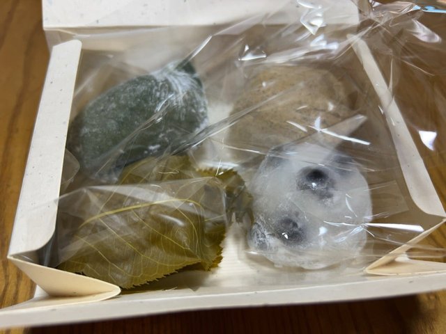 で、今回はいろんな種類の味を楽しみたい!ということで、桜もち、よもぎふと餅、黒豆大福、おはぎきなこを購入。そんな注文をしたばかりに、味がミックスされないように包装していただいてます(汗)