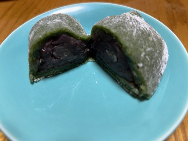 その表現どおり、よもぎをふんだんに使った濃い緑色。その反面、ほどよくよもぎの風味が後味に効く上品な味わいで、つぶあんの控えめな甘さもそれを引き立てています。