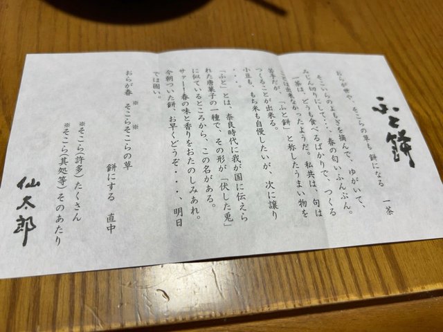 さらに、よもぎふと餅。要は草餅のことで、リフレットには、小林一茶の俳句『おらが世や、そこらの草も餅になる』を引用し紹介。なんでも、奈良時代の唐菓子『ふと(伏した兎)』の形を模してその名が付いたとか。さしずめふと餅を俳句にして表すと『おらが春 そこらそこら(たくさん、そのあたり)の草 餅にする』だそうです。中七字余りですがw