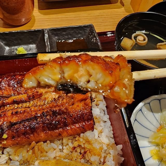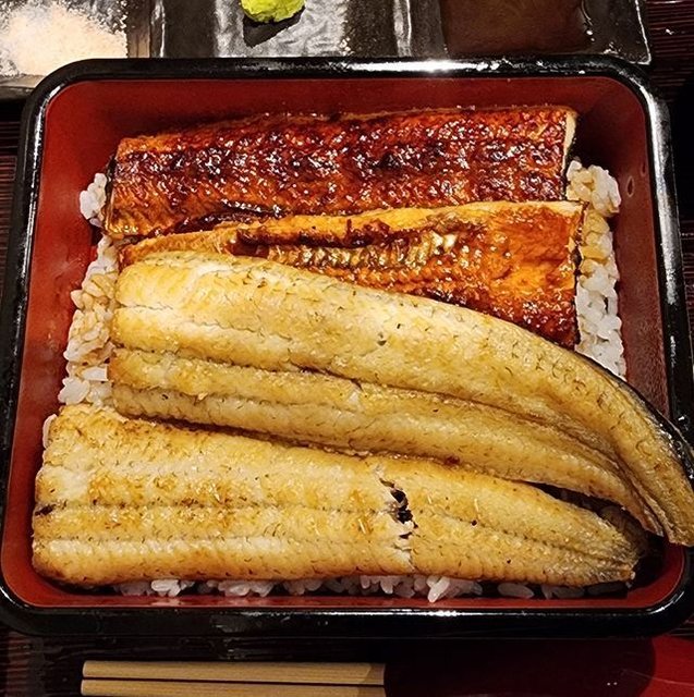 アップ写真。いやー、このボリューム感はなかなか凄いものがありますな。関東風背開き蒸し鰻で、かなり肉厚なものをお使いです。とはいえ、皮のパリッと感は若干残っていて、身は関東風にとろっとまではいかない感じで、しっとりというよりふわっと、という。ま、このお値段でこのボリューム感なのでOK!という。