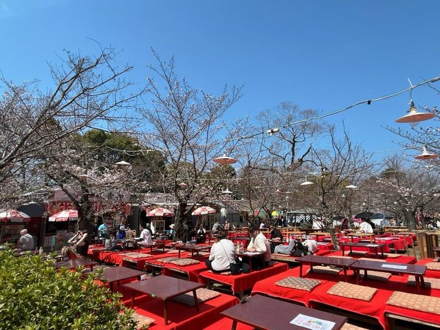 参道にはお花見時期ということもあり多くの出店が並び、さらに毎年恒例の茶屋のちゃぶ台席もセッティング。国内外問わず観桜客に利用され、花見見物とともに飲食を楽めます。そして桜ライトアップもあるため、茶屋は夜も営業し、夜桜見物にも最適。