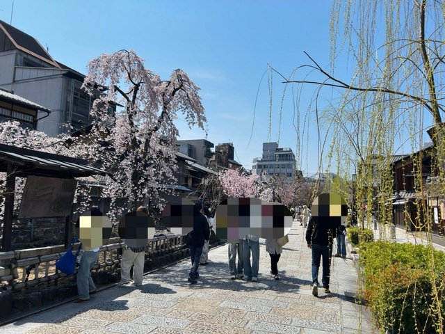 国内外問わず京都屈指の観光名所『祇園白川』。四季折々で京都らしい風情が楽しめ、昼夜問わず多くの観光客がそぞろ歩きし、情緒あふれる景色をバックに記念撮影する人も多い場所。特に『巽橋』周辺が人気スポットで、欄干越しから多くの方が記念撮影。白川沿いにはさまざまな品種の桜の木が植えられ、開花具合もまちまちですが見頃。