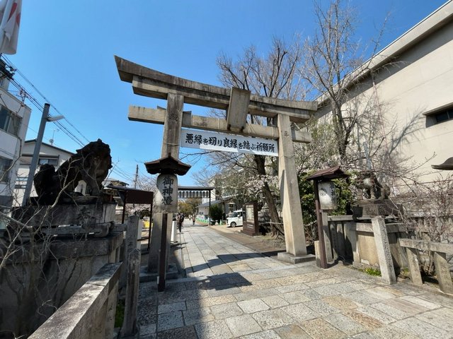 東山安井にある通称『縁切り神社』として知られる『安井金比羅宮』。「悪縁を切り良縁を結ぶ祈願所」というド直球なPOPが燦然と輝く神社で、観光客に人気のスポット。特に東大路通側の鳥居、参道に桜並木が続きますが、わりと見頃で4~5分咲き。