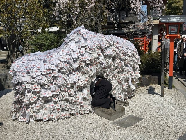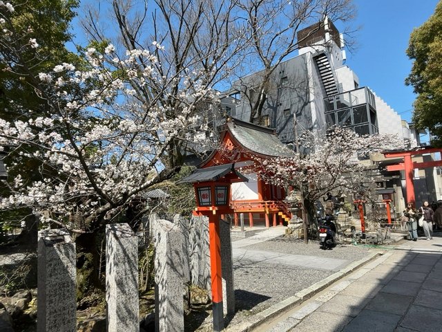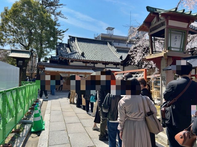 境内では名物『縁切り縁結び碑』くぐりに長蛇の列が。高さ1.5メートル、幅3メートルの絵馬の形をした巨石。そこには願いが書かれた「形代(かたしろ)」という御札が無数に貼り付けら、シュールな光景でもあり。さらに北側鳥居周辺の桜も見頃。